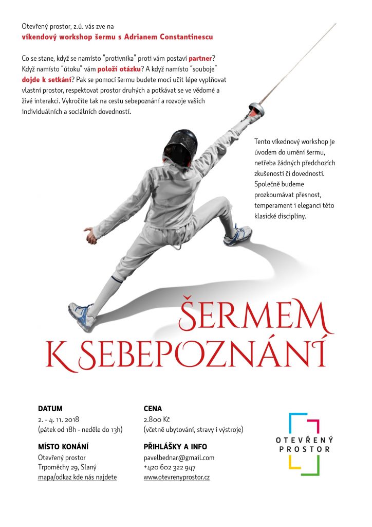 Víkendový workshop šermu s Adrianem Constantinescu, který se uskuteční v Otevřeném prostoru v Trpoměchách.